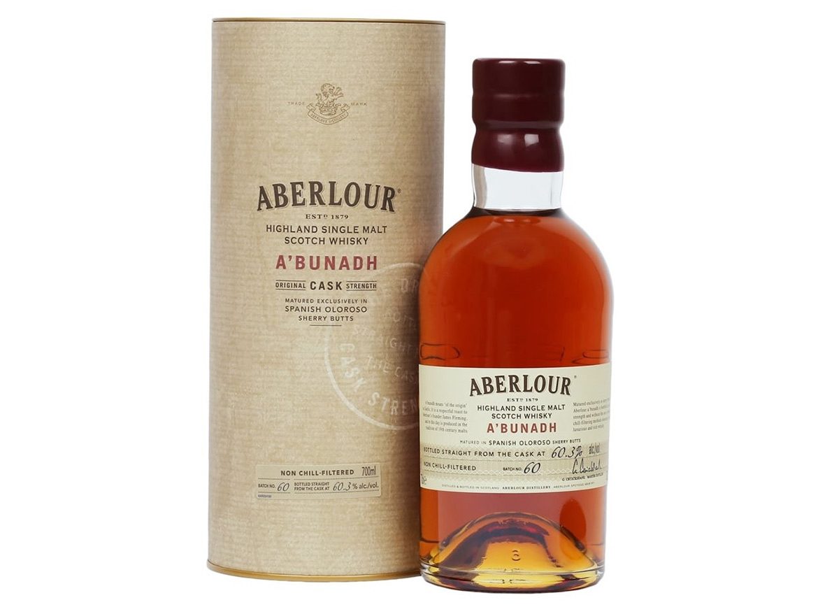 Aberlour A’bunadh, yaş belirtmeyen fıçı gücünde şişelenen ve çevresel koşullara göre her partide minör alkol yüzdesi farklılıkları gösteren bir viskidir. Tahmini olarak 5 ila 25 yıl arasında oloroso şeri fıçılarında olgunlaştırılmış viskilerin fıçı gücünde şişelenmesi ile ortaya çıkan bir ekspresyondur. 1975 yılında damıtımevinde bulunan bir zaman kapsülünün içinden, 1898 yılında damıtımevinde çıkan bir yangından bahseden bir gazete ve yine 1898 yılına ait bir şişe Aberlour çıkmıştır. Bulunan şişe Keith Moray tarafından laboratuvarda inceletilmiş ve bulunan reçete A’bunadh’ı ortaya çıkarmıştır. Galce’de “köken” demek olan A’bunadh’ın mevcut tadım notu 60. batch için olup 2017 yılında %60,3 alkol oranı ile şişelenmiştir. A’bunadh “San Francisco World Spirits Competitions”’da 2007, 2008, 2009 ve 2011 yıllarında gümüş madalya kazanmıştır.